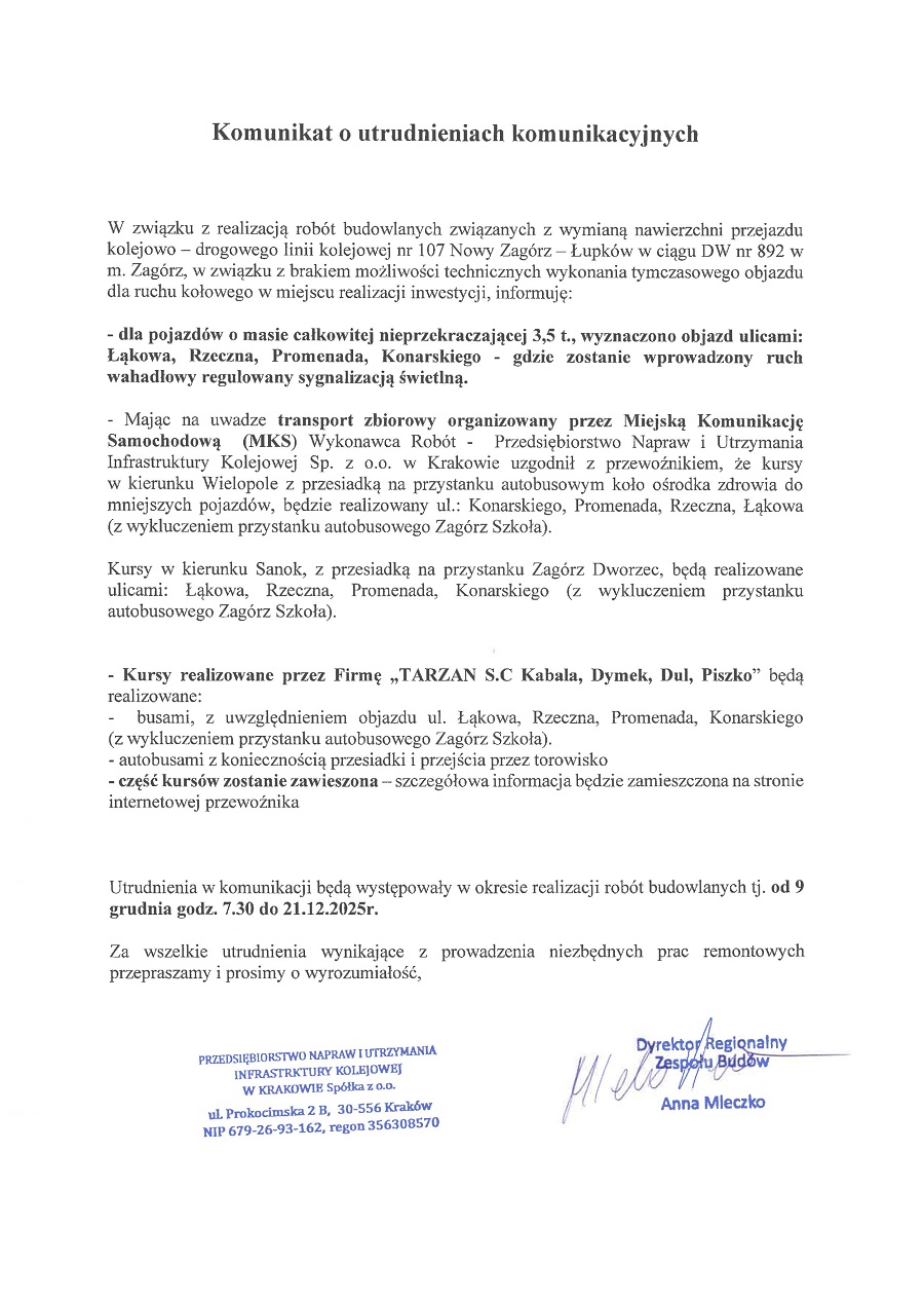 KOMUNIKAT O UTRUDNIENIACH KOMUNIKACYJNYCH
